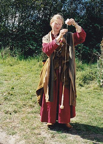 https://commons.wikimedia.org/wiki/File:Costumed_early_middle_age_woman_spinning_drop_spindle.jpg av Peter van der Sluijs med Creative Commons Attribution-Share Alike 3.0 Unported, 2.5 Generic, 2.0 Generic and 1.0 Generic licens.