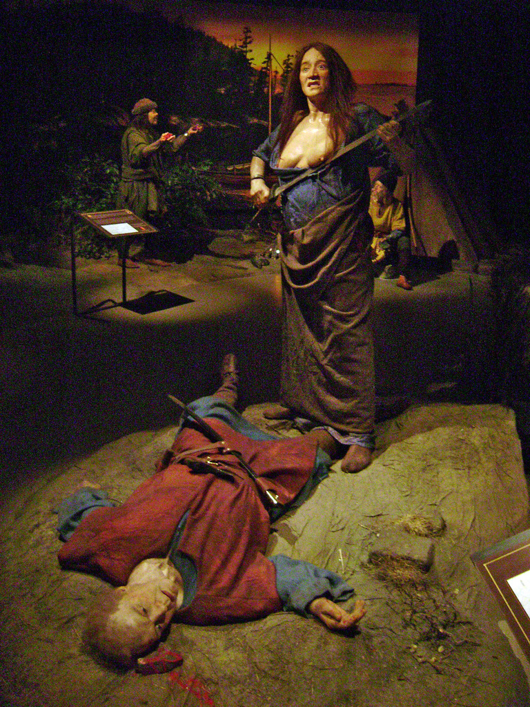 Hon tog upp svärdet från en död viking och sprang vrålande mot skrälingarna medan hon slog med svärdsklingan mot sina nakna bröst. En syn som drev förföljarna på flykten.