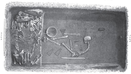 Skiss över graven samt teckning utifrån gravgåvorna